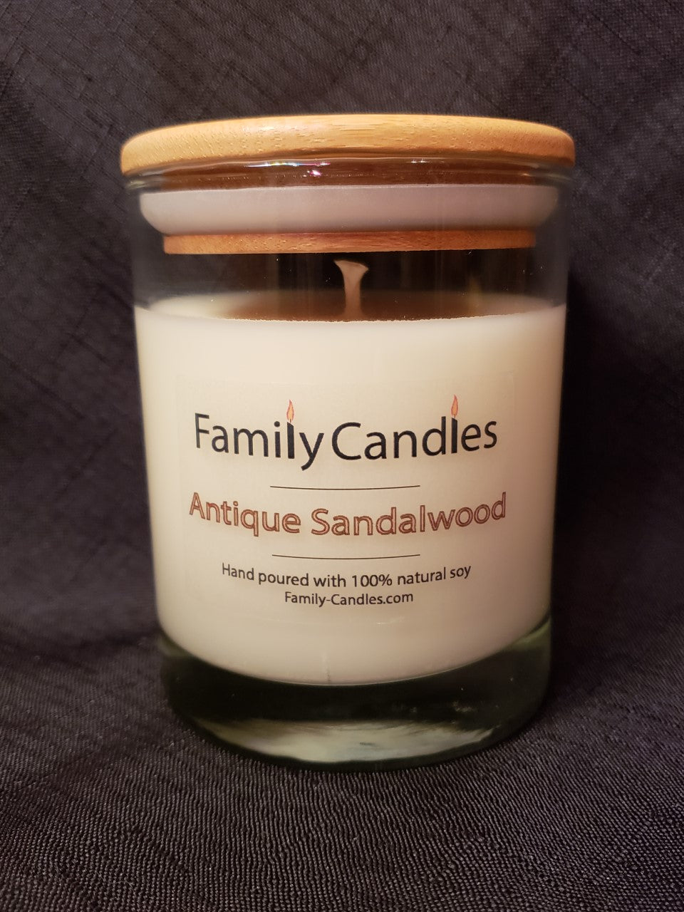 - Antique Sandalwood 12oz Soy Candle - A woody, musky heart made from sustainably harvested sandalwood and cedarwood essential oils, softened with subtle notes of violet and jasmine. This scent is infused with natural essential oils including Cedarwood, Patchouli and Sandalwood.