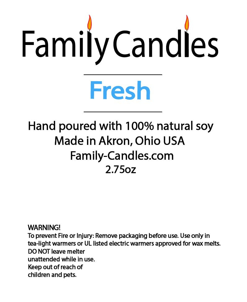 Fresh! 2.75 Wax Melt- Our Fresh fragrance starts with bright top notes of lemon, crisp apple, and ozone. Middle notes of delicate jasmine and white cotton blossoms add a floral touch to this airy fragrance. Hints of violet and cedar round out the scent, while lemon essential oil enhances the clean, citrus element. Think clean laundry!