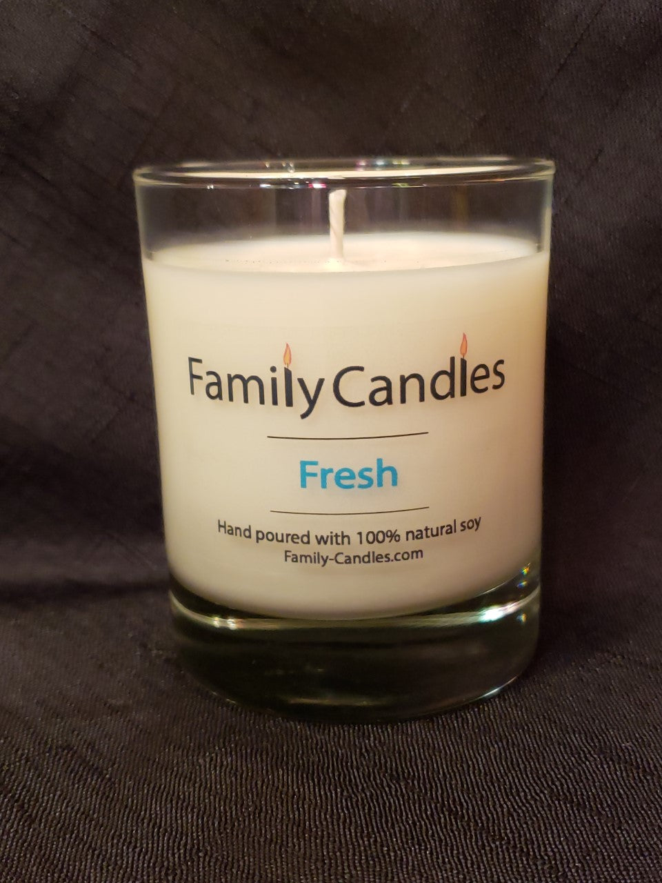 - Fresh! 8oz Soy Candle- Our Fresh fragrance starts with bright top notes of lemon, crisp apple, and ozone. Middle notes of delicate jasmine and white cotton blossoms add a floral touch to this airy fragrance. Hints of violet and cedar round out the scent, while lemon essential oil enhances the clean, citrus element. Think clean laundry!
