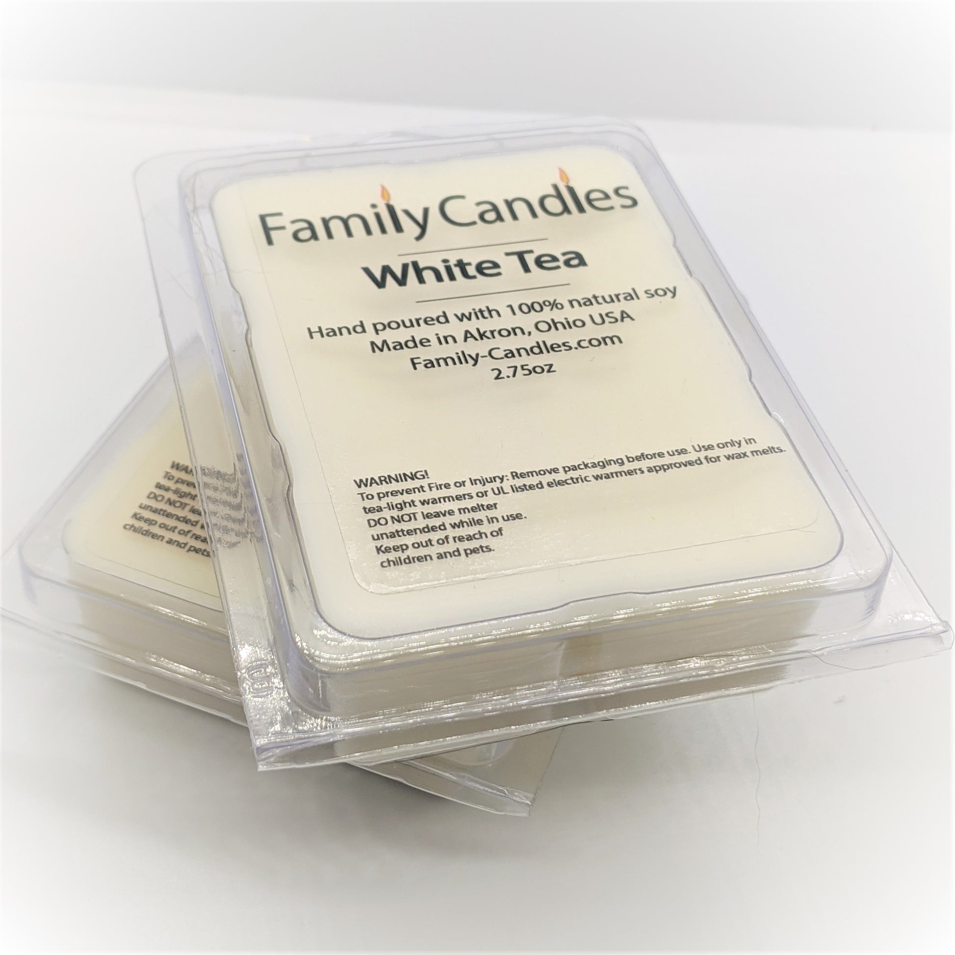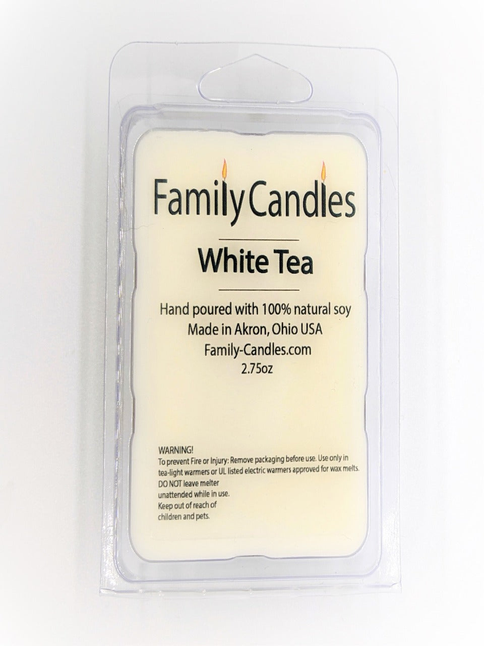 White Tea 2.75 Wax Melt - White Tea is the ultimate, luxurious spa fragrance. It starts with fresh citrusy top notes of mandarin and bergamot. Middle notes of thyme and ginger add an herbal spice that blends beautifully with delicate jasmine blossoms. Chrysanthemum petals and white tea buds round out the base of this exquisite fragrance. White Tea is infused with a dozen essential oils including jasmine, bergamot, mandarin, lemon, and ginger which all add to the natural quality of the scent.