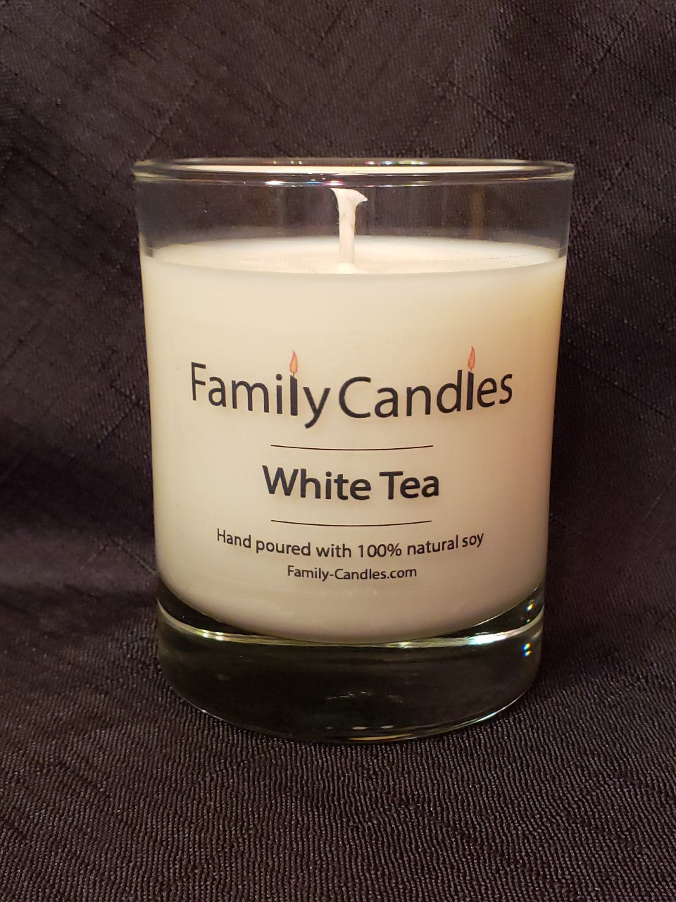 - White Tea 8oz Soy Candle - White Tea is the ultimate, luxurious spa fragrance. It starts with fresh citrusy top notes of mandarin and bergamot. Middle notes of thyme and ginger add an herbal spice that blends beautifully with delicate jasmine blossoms. Chrysanthemum petals and white tea buds round out the base of this exquisite fragrance. White Tea is infused with a dozen essential oils including jasmine, bergamot, mandarin, lemon, and ginger which all add to the natural quality of the scent.