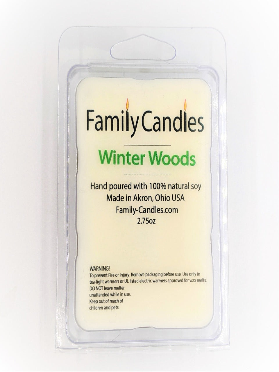 Winter Woods 2.75oz Wax Melt - Saunter through an evergreen forest with our Winter Woods fragrance. This upscale scent opens with refreshing ozone, bay laurel, and cooling eucalyptus. Middle notes of cypress, moss, and bayberry blend with rich undertones of fir balsam, patchouli, and sweet incense. Fir, patchouli, eucalyptus, and mint essential oils intensify the fresh foliage notes.